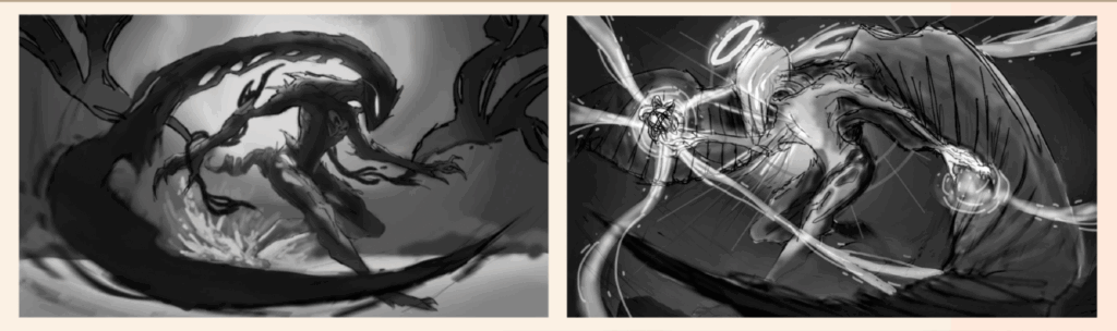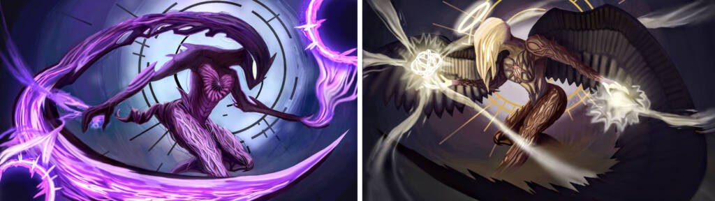 A dynamic splash art illustration featuring original characters that embody the contrasting forces of life and death. The piece explores balance through color, lighting, and composition — with life portrayed in warmth and motion, and death in stillness and shadow. Designed to feel cinematic and emotionally charged, the artwork highlights character design, narrative contrast, and symbolic storytelling within a single dramatic scene.