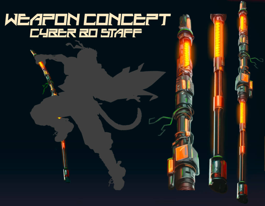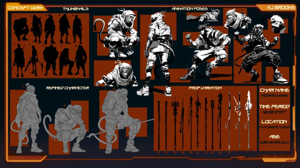 This final design reinterprets the Monkey King as a futuristic hero, merging ancient legend with advanced technology. His body is enhanced with cybernetic augmentations that amplify agility, strength, and reflexes, allowing him to leap, climb, and strike with superhuman precision. The staff has been redesigned as a modular weapon—able to extend, split, and project energy fields—making it versatile for both close-quarters combat and long-range attacks. Instead of traditional armor, his look integrates sleek exoskeletal plating with glowing circuit patterns, accented by a palette of metallic tones with vivid red and gold highlights. This balance of mythic symbolism and sci-fi engineering creates a character suited for fast-paced gameplay in a futuristic game world.