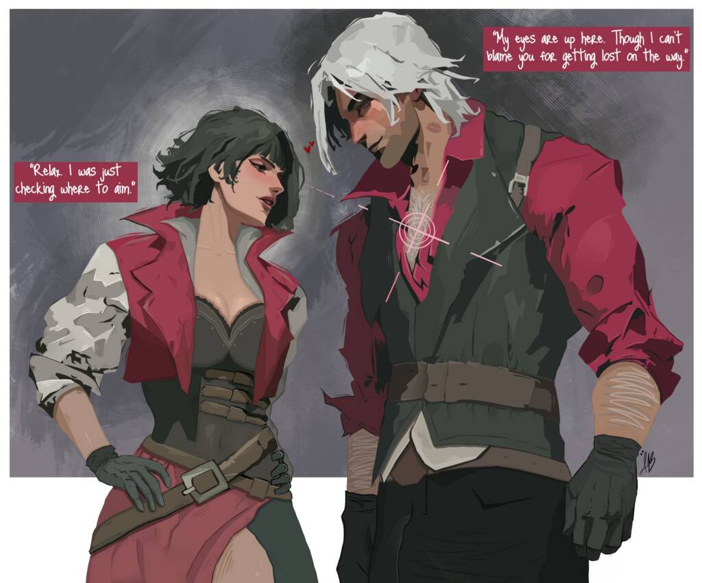A Valentine’s Day commission featuring Dante and Lady, created to capture the raw passion simmering beneath their usual sharp-tongued banter. Known for their snappy quips and constant back-and-forth, this piece sets the sarcasm aside to focus on the tension that lingers when the walls drop—close proximity, steady hands, and an intensity that feels both fiery and restrained. I pushed myself stylistically, experimenting with a new rendering approach and moodier lighting than I’ve used before, aiming to give their chemistry a softer yet more cinematic weight while still honoring their bold, unmistakable energy.