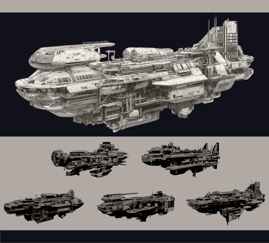 A highly detailed spaceship design concept, showcasing intricate mechanical structures, layered armor plating, and functional elements that convey scale and realism. The piece emphasizes meticulous detailing, from engine components to surface textures, blending science-fiction aesthetics with believable engineering. Through careful attention to lighting, perspective, and structural design, the concept communicates both the ship’s power and narrative potential within a larger sci-fi universe.