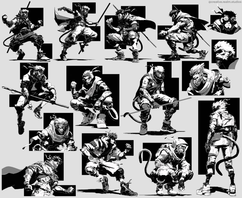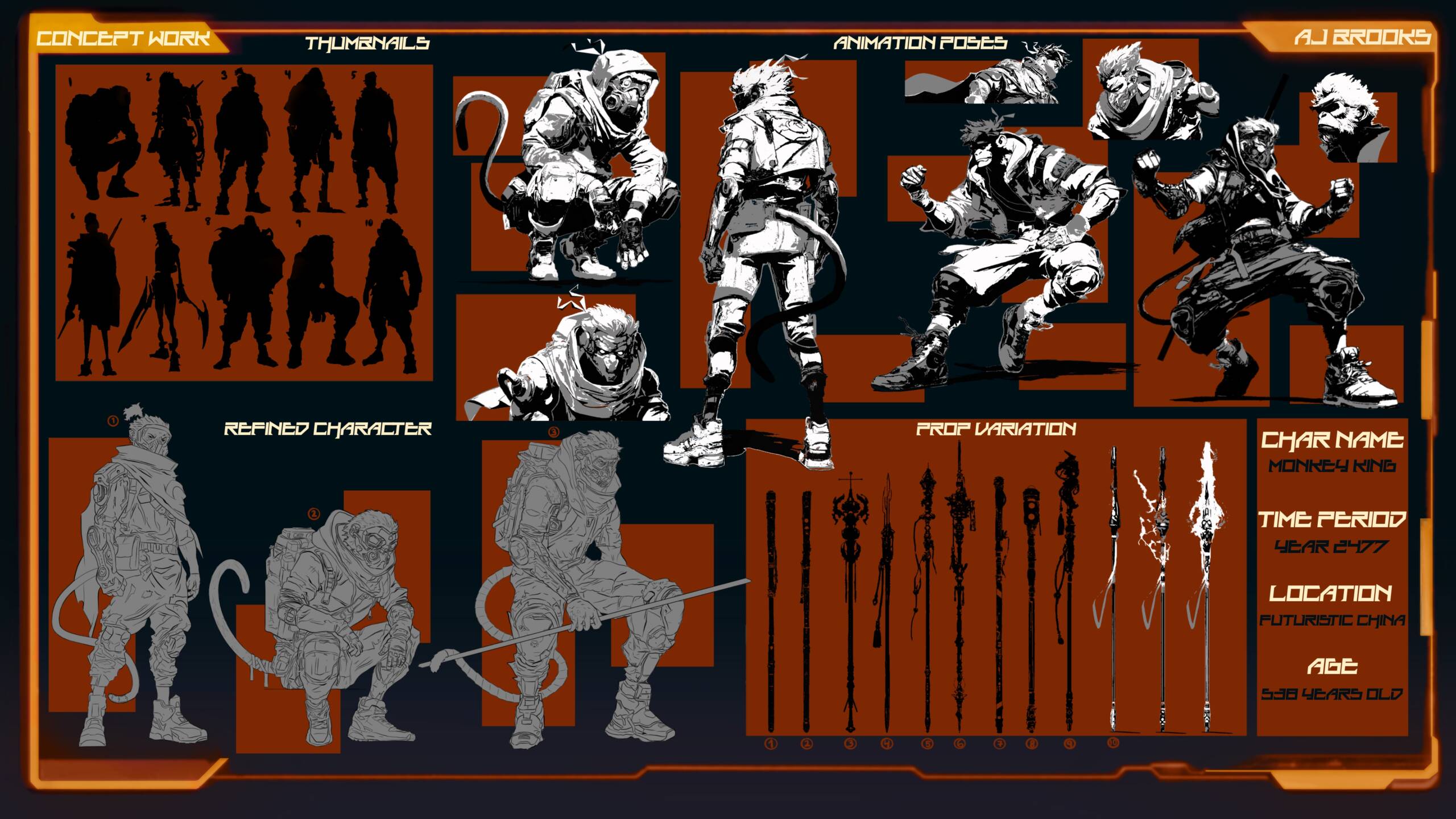 The final design of the Monkey King reimagines the legendary figure as a fully realized game character. Built from the foundation of earlier sketches and studies, the design captures his mischievous energy, agility, and mythic strength in a form ready for gameplay. Iconic details such as the staff and flowing garments are integrated into a streamlined silhouette that emphasizes readability in motion and combat. A bold palette of reds and golds reinforces his cultural roots, while modern accents add versatility for different in-game environments. The result is a dynamic, story-driven character concept that bridges mythology with contemporary game design.