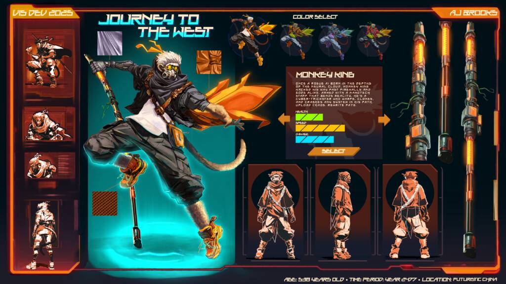 Final concept work for the Monkey King, a futuristic take on the mythical monkey. Spicing it up with a cyberpunk aesthetic.