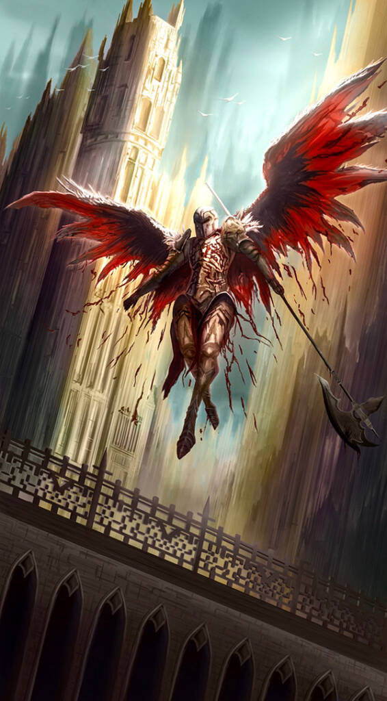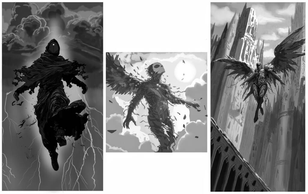 A dramatic concept illustration depicting a blood-soaked knight soaring through the sky on crimson-stained wings above a grand, regal city. Inspired by Achilles-like heroism, the piece blends mythic elegance with brutal power, capturing the moment between glory and tragedy. The design emphasizes dynamic motion, cinematic lighting, and ornate armor detailing, reflecting themes of sacrifice, valor, and divine wrath within a high-fantasy setting. Below are some other thumbnails for our project labelled “Flight”.