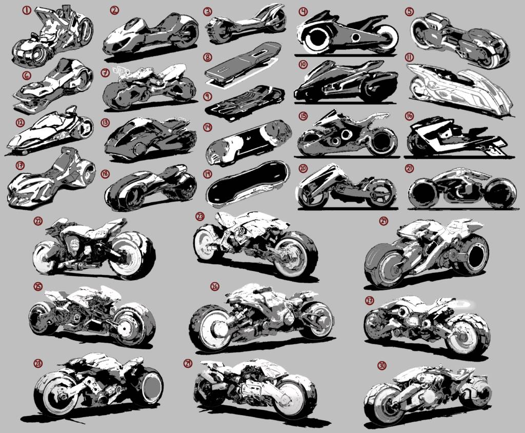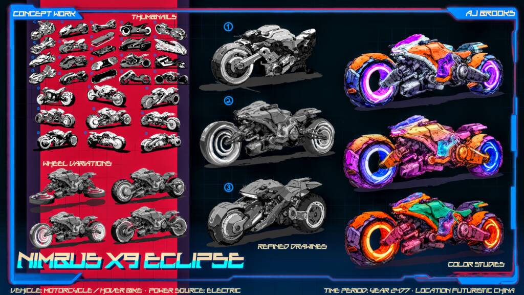 A concept exploring a futuristic motorcycle that converts into a hoverbike by rotating its wheels, blending functionality with a sleek, cyberpunk aesthetic. The design emphasizes dynamic form, mechanical ingenuity, and urban futurism. The project includes sketches, thumbnails, and color studies to experiment with shapes, perspective, and lighting, bringing the vehicle to life with bold neon accents, reflective surfaces, and contrasting color palettes. Each iteration focuses on visual storytelling, ensuring the design feels both plausible and cinematic in a cyberpunk cityscape.