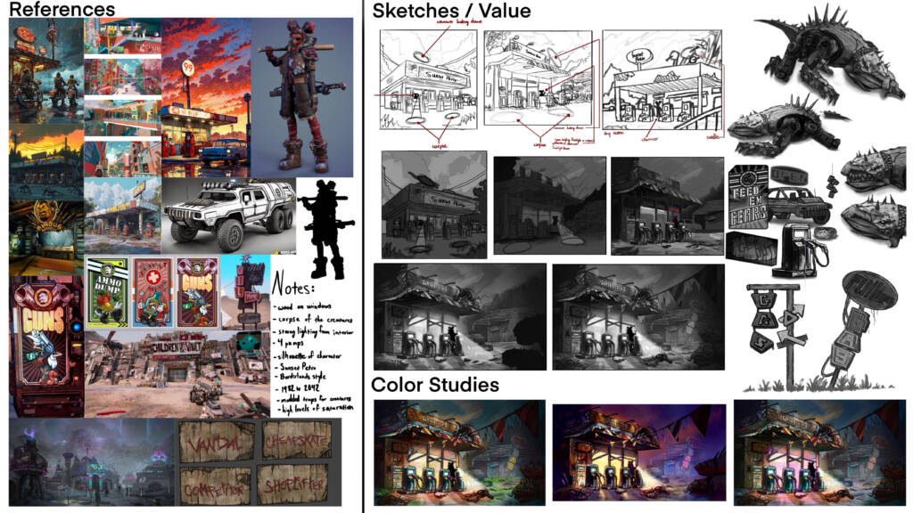 This piece was created as part of the entrance test for the Visual Development emphasis within the Illustration major at Ringling College of Art and Design, a selective program offering only thirty available spots. The assignment challenged students to design a unique gas station concept, emphasizing worldbuilding, design storytelling, and stylistic individuality.