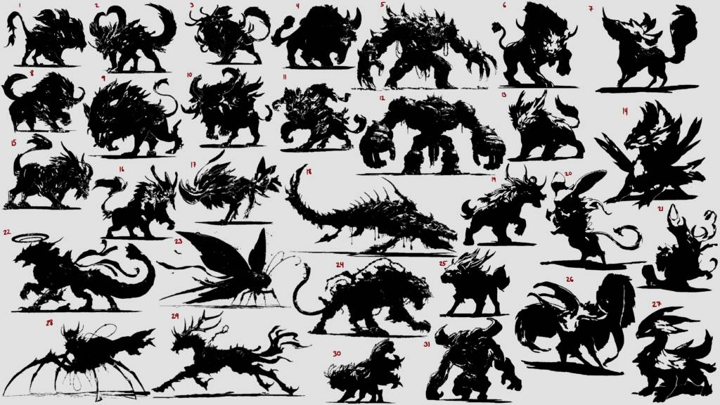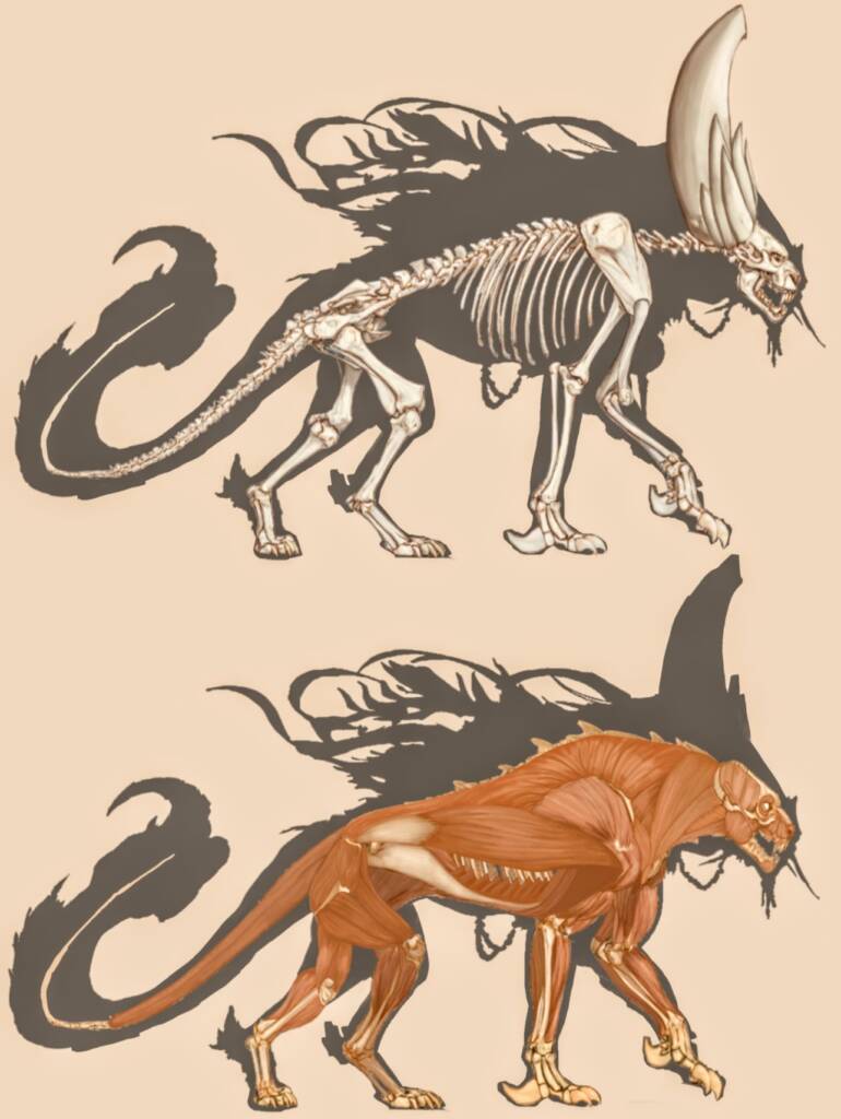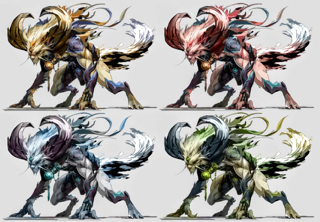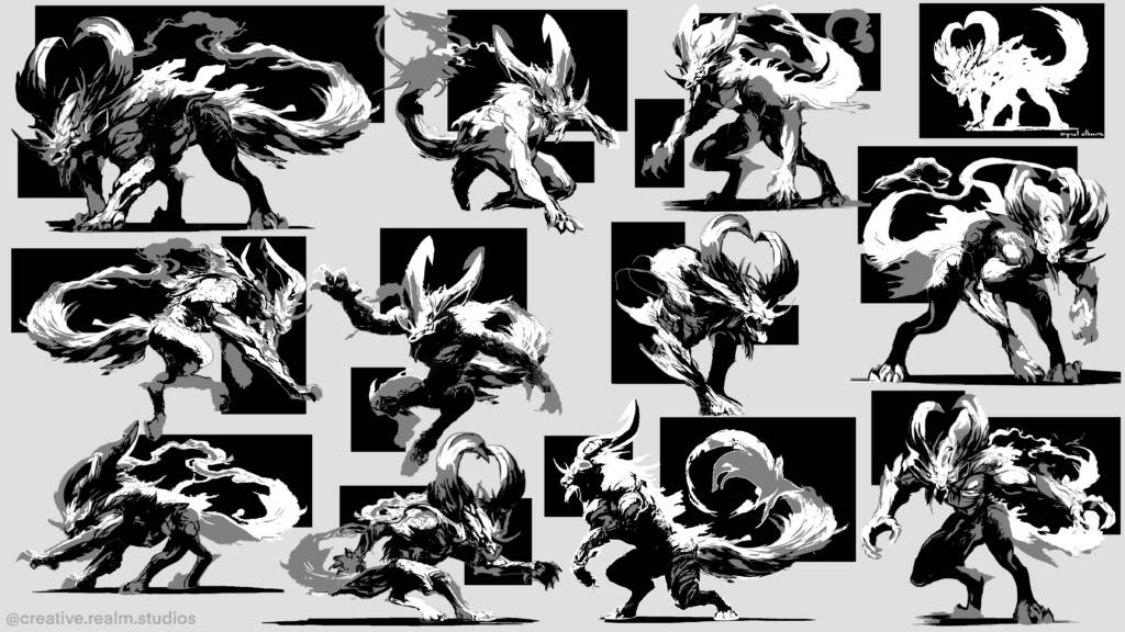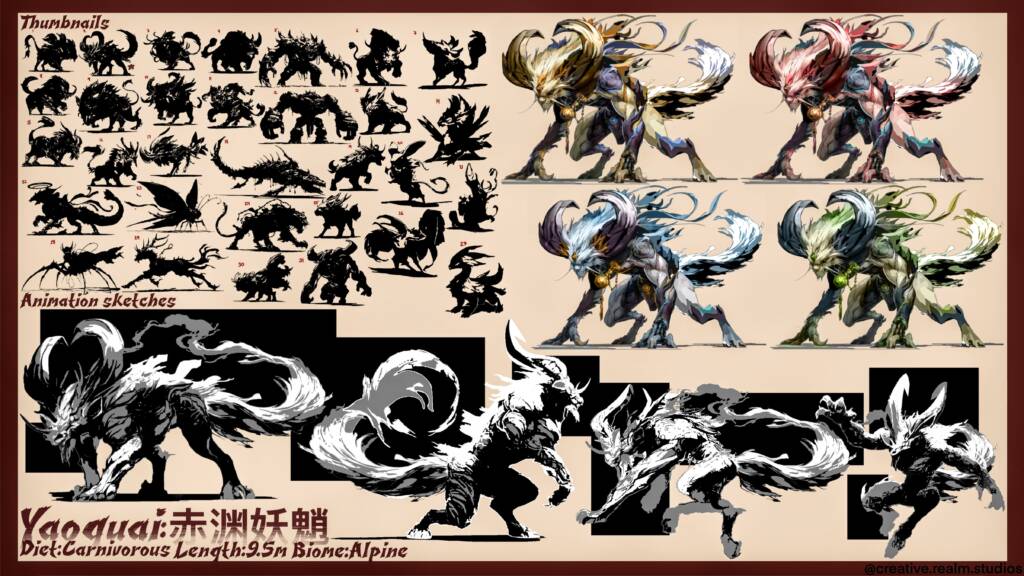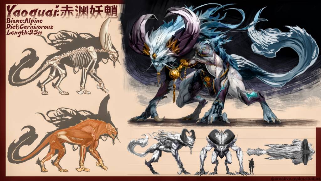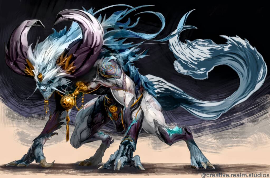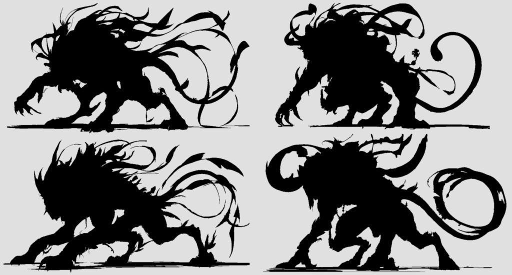 Black Myth Wukong inspired Monster Concept Design. The creature’s massive arms drag deep gouges into the stone as it moves. Feline hind legs allow sudden, impossible bursts of speed, while a long, flowing tail whips like a banner of spirit fire. Huge curling horns, adorned with the shattered jewelry of fallen priests, gleam faintly in the dark — each ornament ringing softly like a bell of mourning. Bits of ornate armor and silk talismans flutter around its body, remnants of the temple’s divine vestments now corrupted and alive with restless energy.